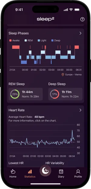 Teilnehmende tragen handelsübliche POLAR H10 oder Verity Sense Sensoren während des Schlafs. Diese erfassen Herzrate und Inter-Beat-Intervalle (IBIs) mit hoher zeitlicher Auflösung und übertragen die Daten automatisch in die sleep² App. So wird Schlaf objektiv, präzise und nicht-invasiv im Alltag dokumentiert.